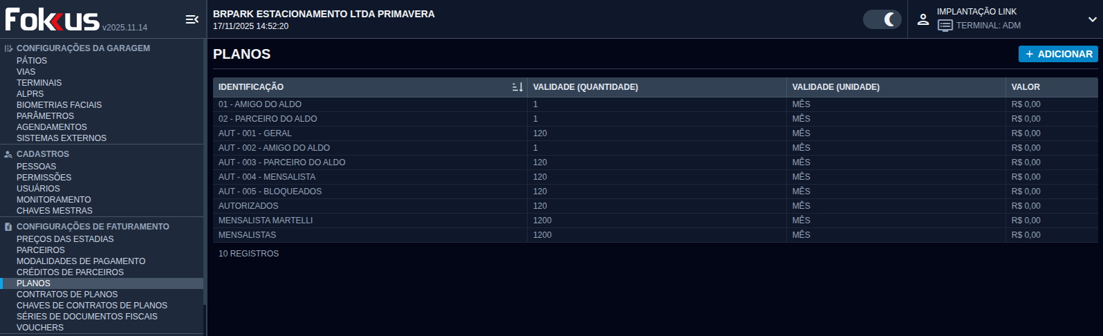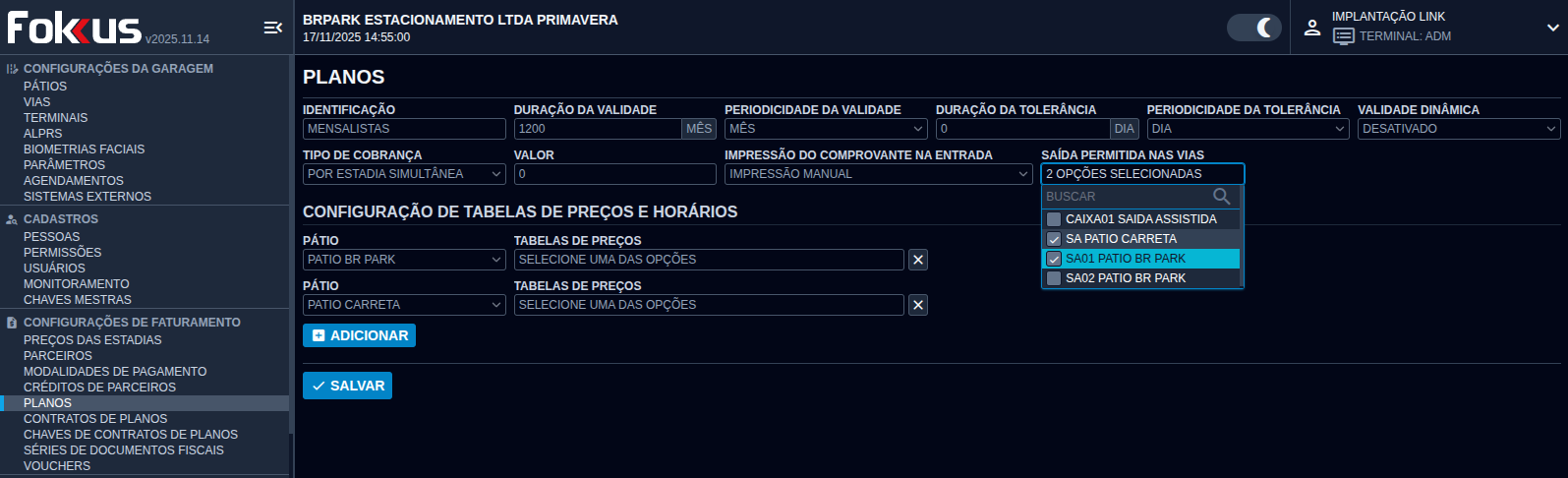 Cada plano de estacionamento (mensalista, autorizado, credenciado, etc.) pode ter configurações específicas de vias de entrada e saída, permitindo um controle refinado do fluxo de veículos conforme as regras operacionais do estacionamento.