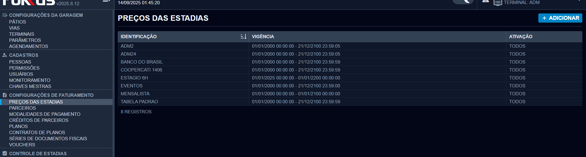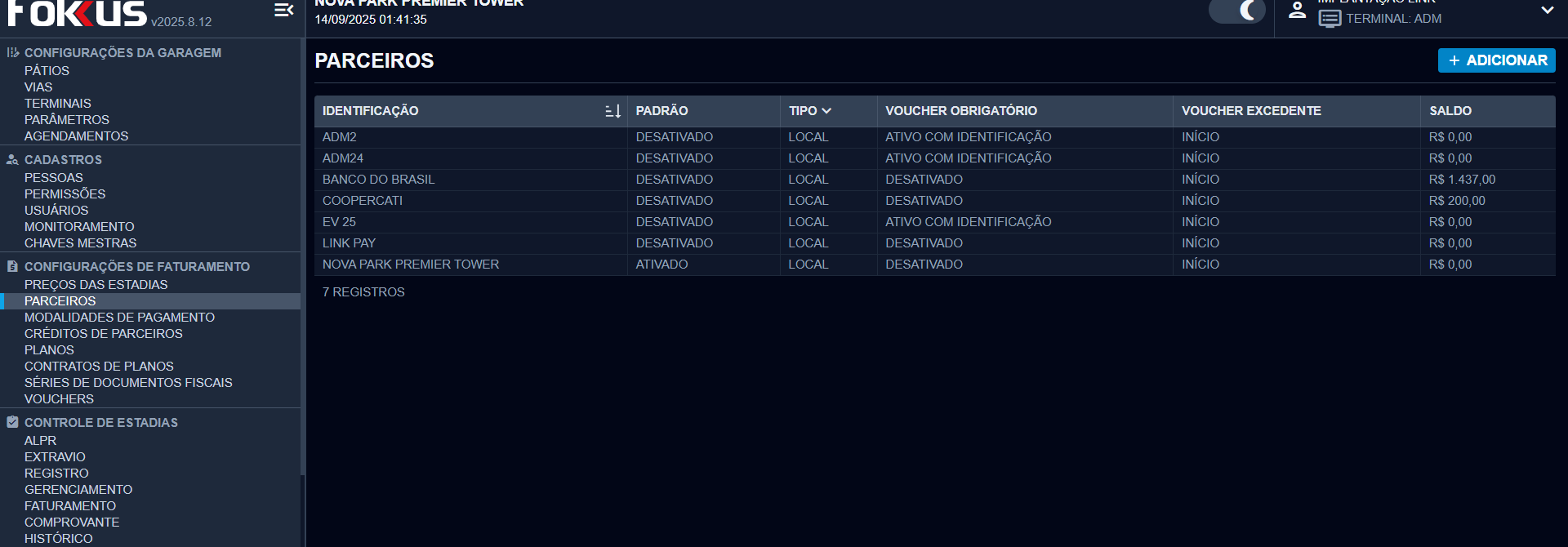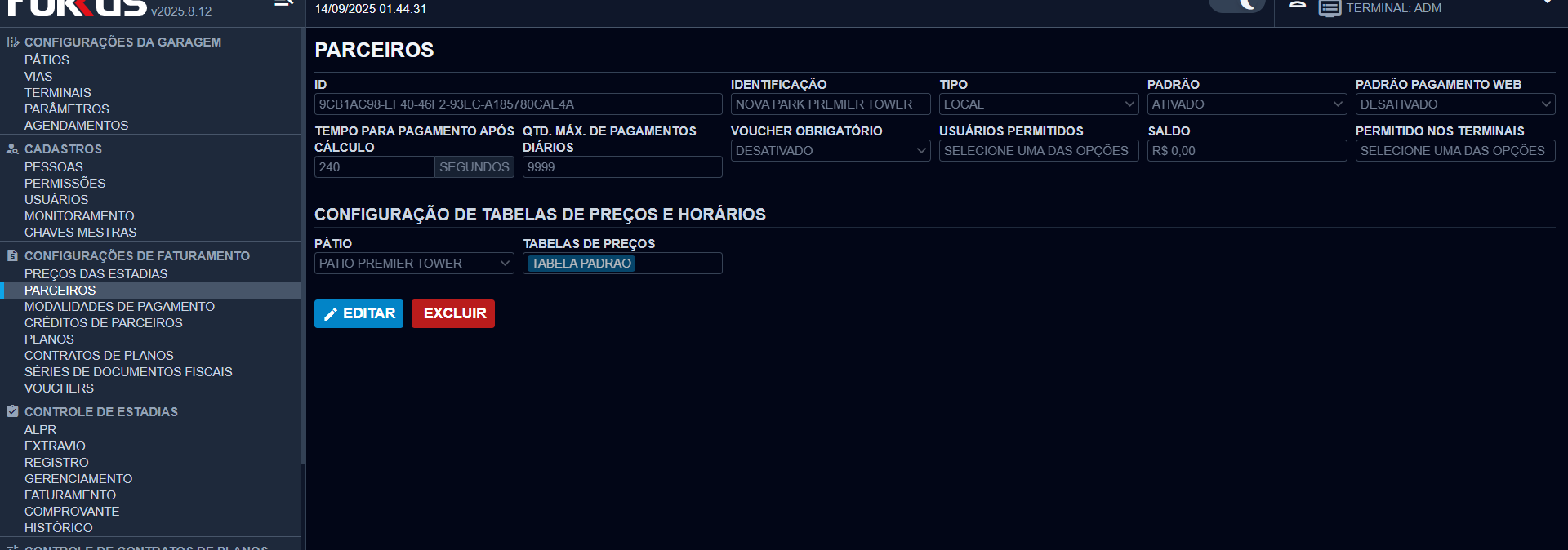 Se quiser alterar a tabela de rotativo (utilizada para cobrança de entradas automatizadas), acesse o menu PARCEIROS e localize o PARCEIRO PADRÃO (ATIVADO).