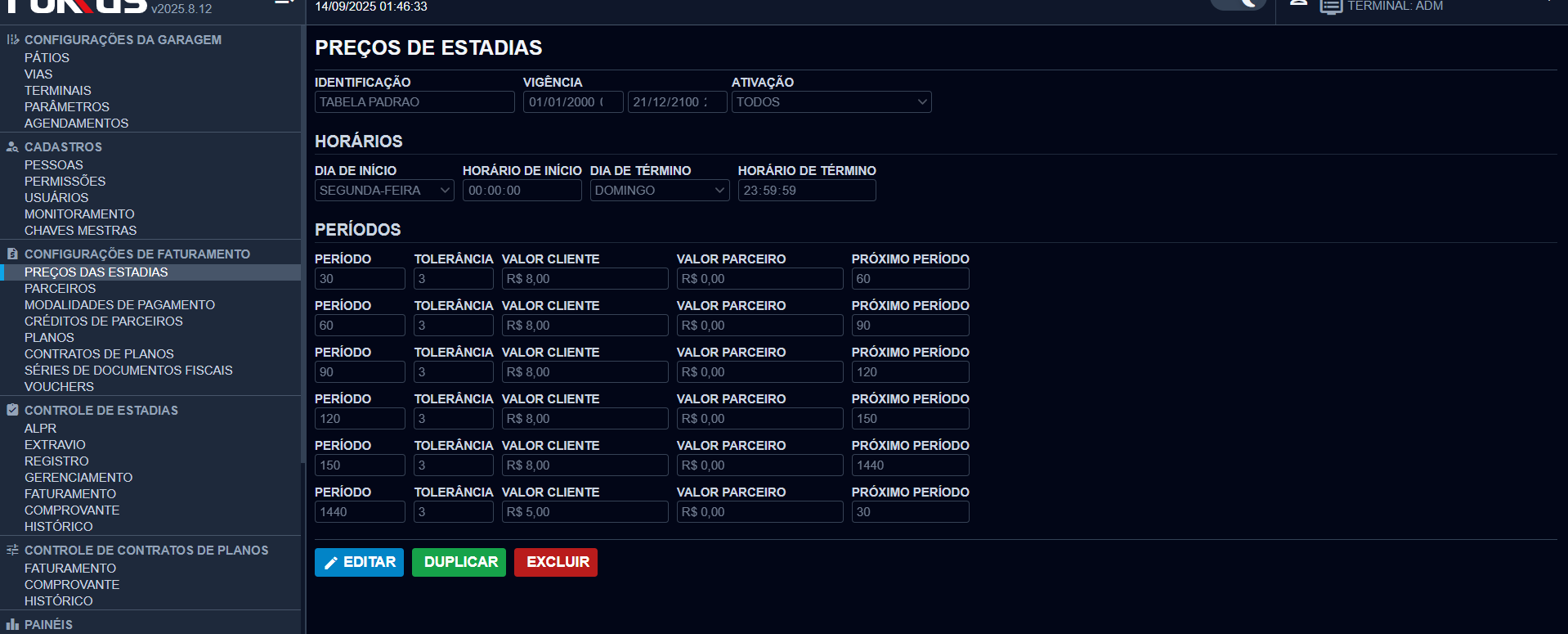Dentro do parceiro, confira em Configuração de Tabelas de Preços e Horários qual tabela está associada ao pátio.