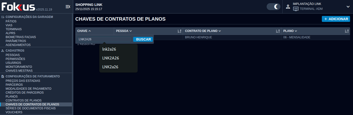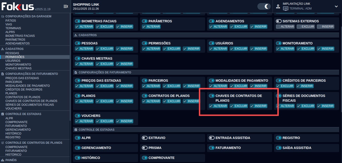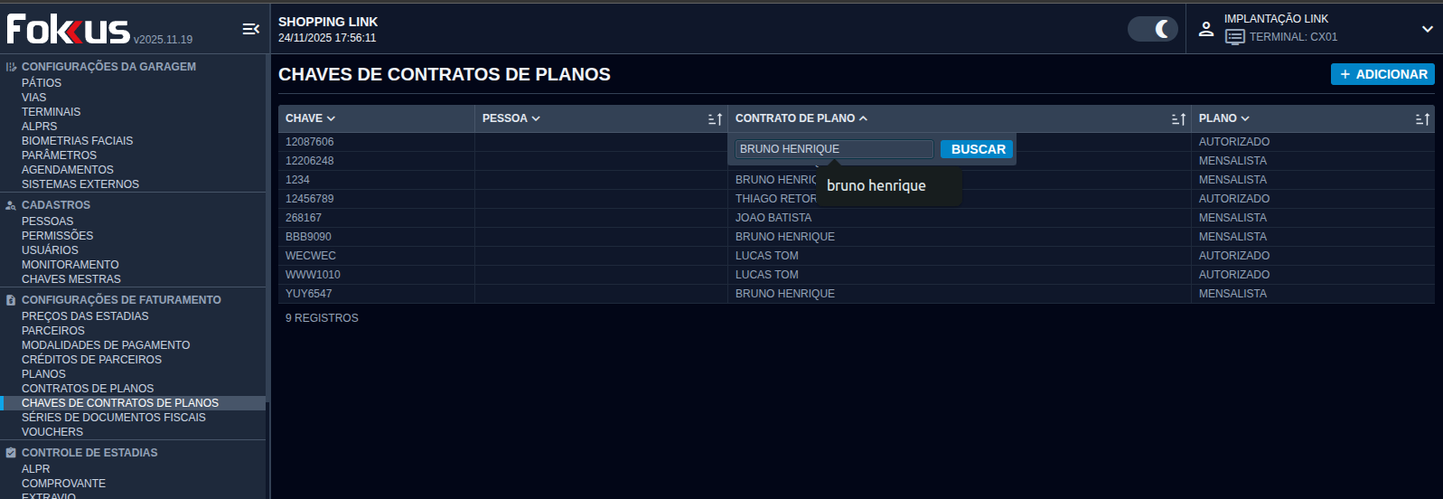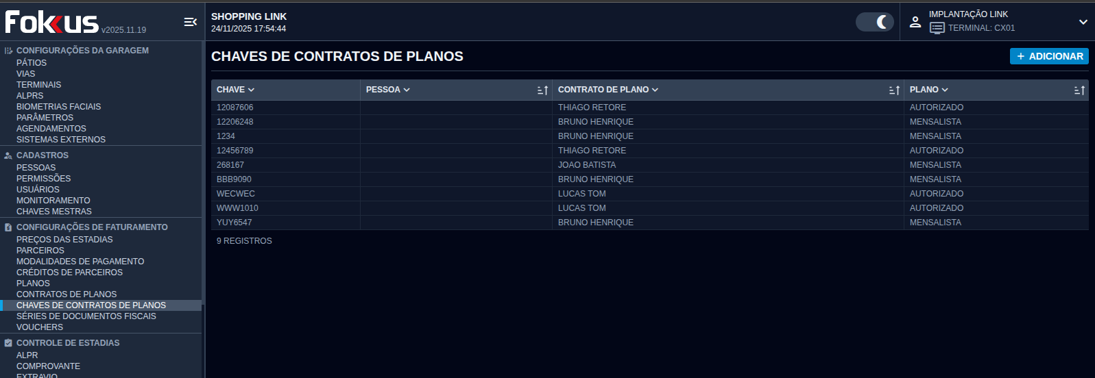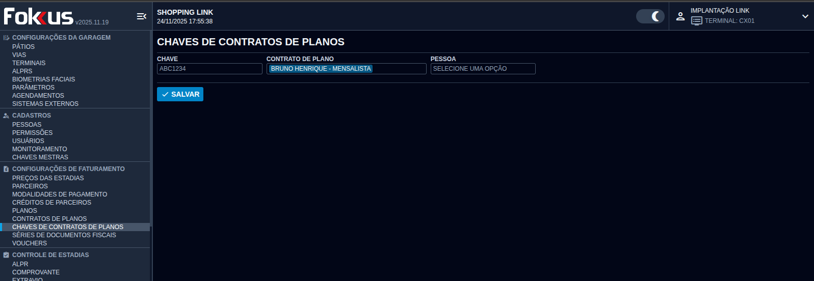 A partir da versão v2025.11.18, o cadastro de chaves não fica mais em CONTRATOS DE PLANOS e sim no novo menu CHAVES DE CONTRATOS DE PLANOS.