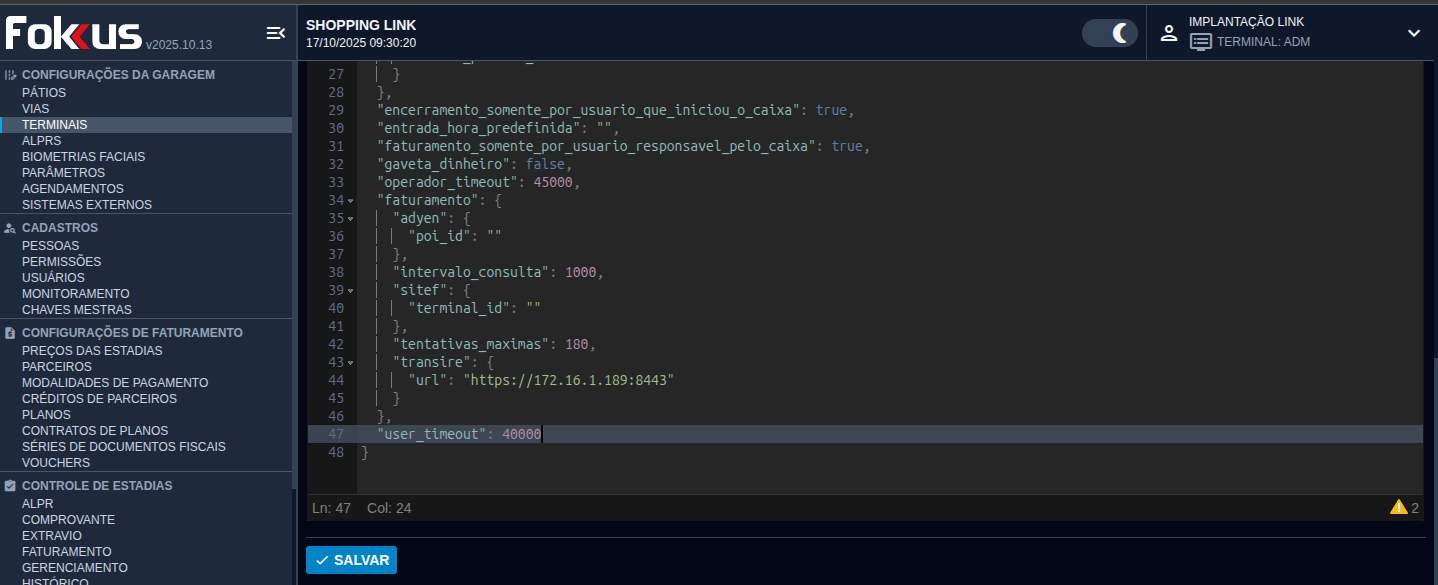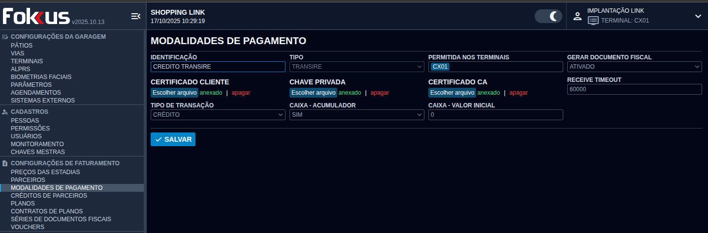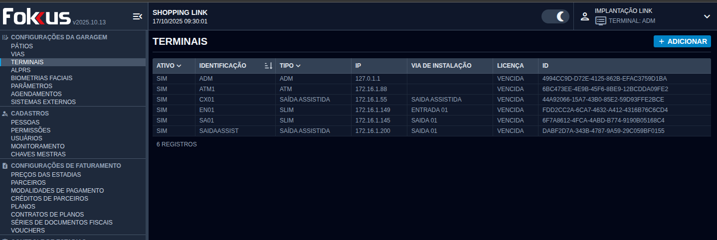 Acesse Configurações da Garagem → TERMINAIS e configure cada terminal de caixa e ATM que utilizará a Transire: