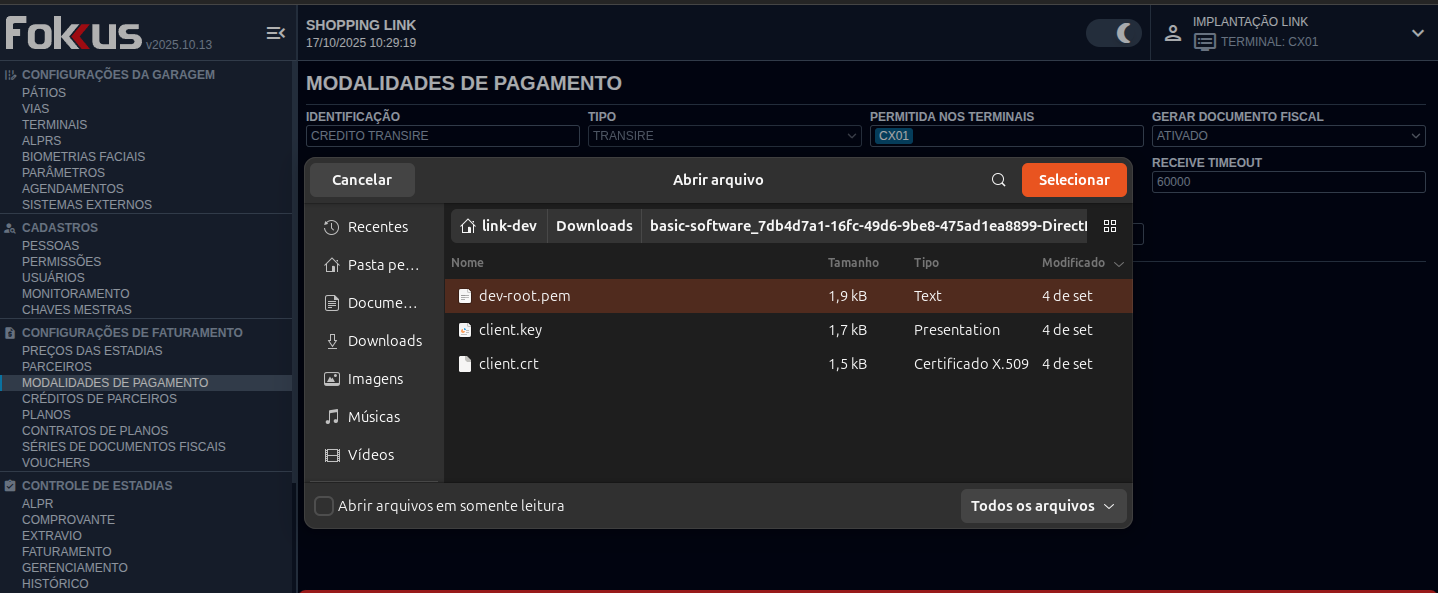 São necessários 3 arquivos de certificados fornecidos pela Transire (disponibilizados pelo cliente):