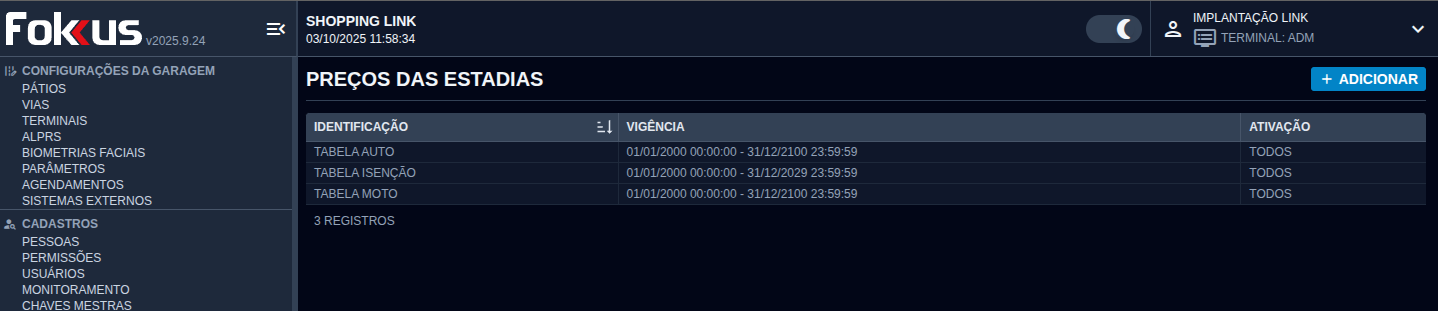 - Na seção CONFIGURAÇÃO DE TABELAS DE PREÇOS E HORÁRIOS: