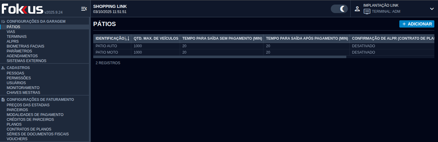 - ✅ Criar pátios distintos (AUTO e MOTO)