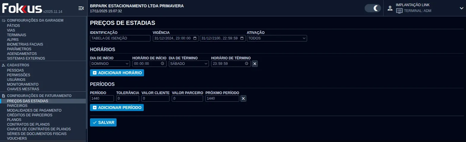 Vincule a tabela de excedente (normalmente a tabela padrão do estacionamento)