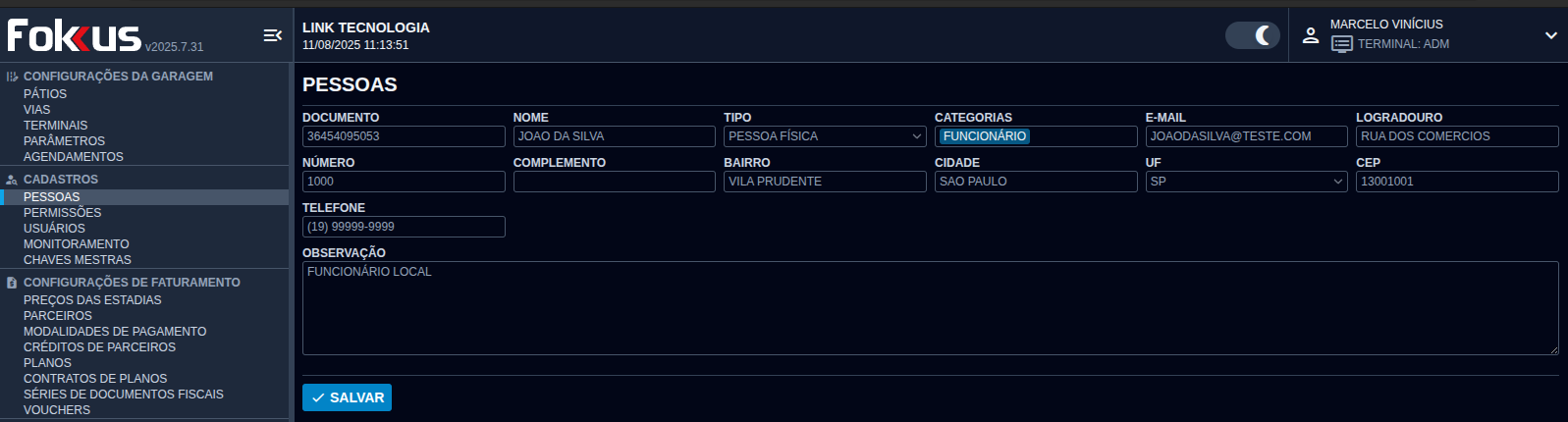 Dica: Certifique-se de que a categoria "Funcionário" esteja selecionada no cadastro da pessoa, caso contrário não será possível criar o usuário no sistema.