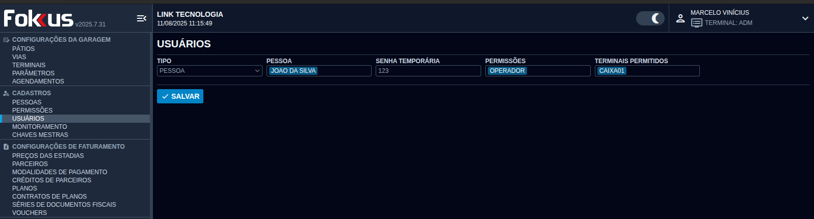- Terminais permitidos: Informe quais terminais o usuário poderá acessar (ex: Caixa 01, Caixa 02)