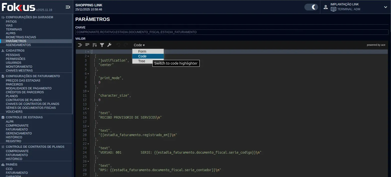 - Com o parâmetro selecionado, clique para alternar para o modo Code (facilita a visualização e edição do JSON)