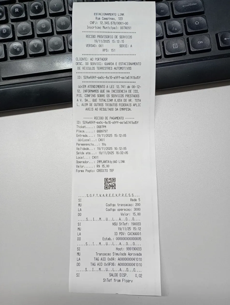 A via do cliente aparecerá na parte inferior do recibo, após o QR Code e informações fiscais, contendo todos os dados da transação processada pelo terminal Sitef.