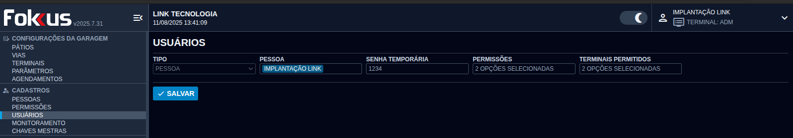 Acesse CADASTROS > USUÁRIOS → Localize o usuário desejado