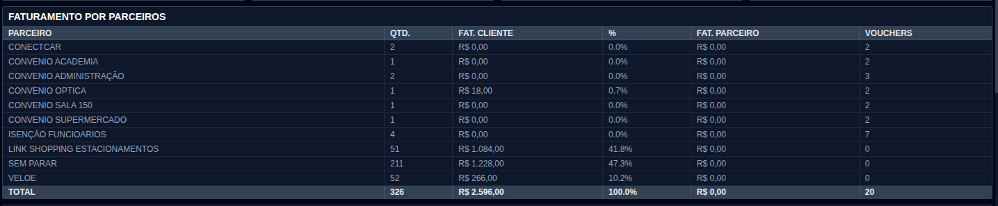Empresas, entidades conveniadas, e vouchers que possuem acordo comercial com o estacionamento (exemplos: SEM PARAR, Veloe, convênios corporativos, E TAMBÉM O PŔOPRIO ESTACIONAMENTO (PARCEIRO PADRÃO)).