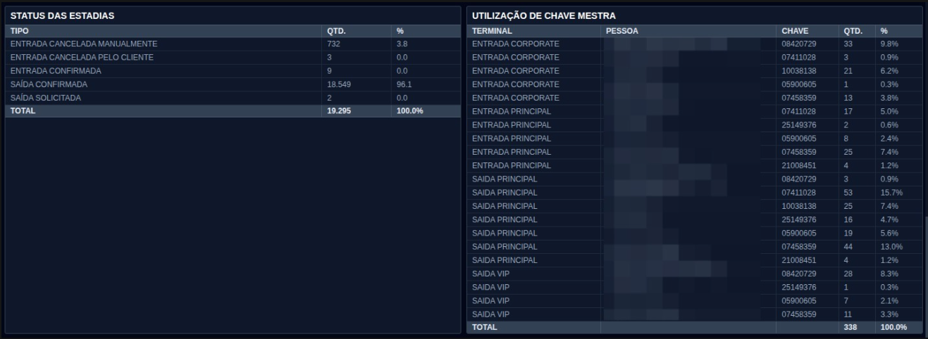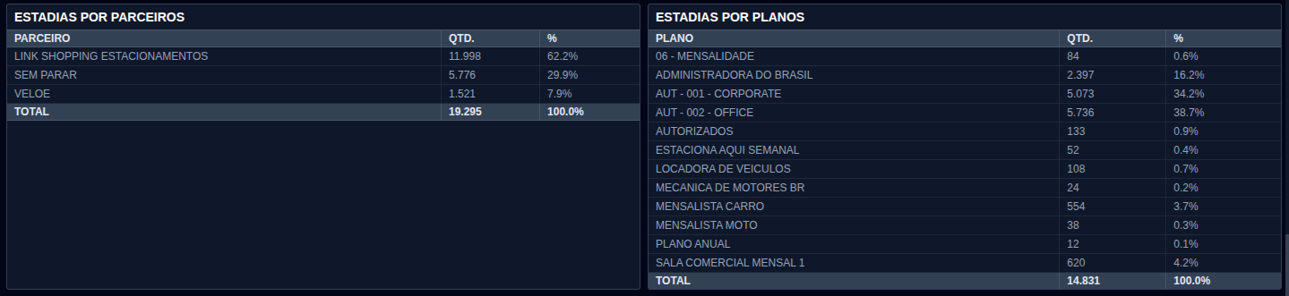 - Planos: Veículos de clientes que possuem planos ativos (mensalistas, conveniados, autorizados).