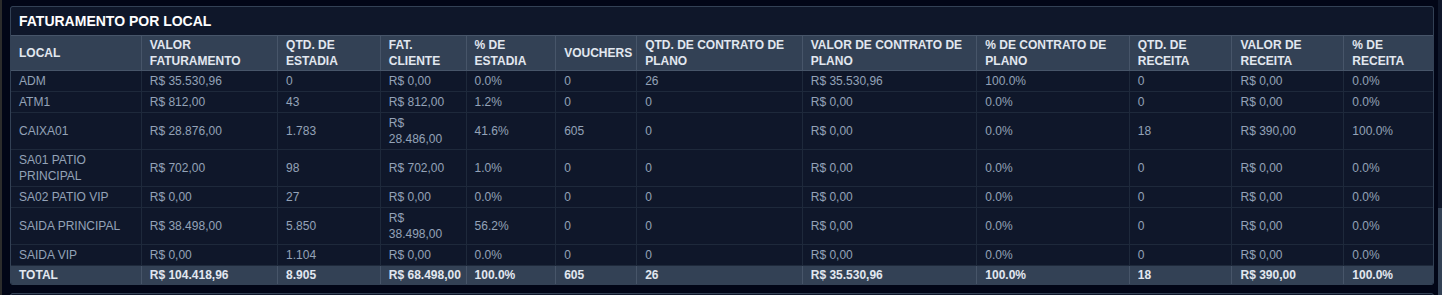 - Faturamento de Rotativos: Receita gerada por clientes avulsos que pagam pela permanência no estacionamento (não são mensalistas/planos).