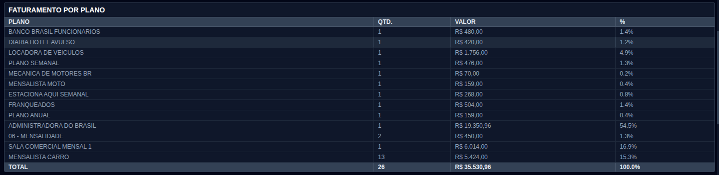 Apresenta o faturamento gerado especificamente pelos contratos de planos e mensalidades durante o período consultado. Esta seção é diferente de "Estadias por Planos" (que mostra quantidade de entradas/saídas) - aqui você visualiza a receita financeira proveniente das cobranças de planos.