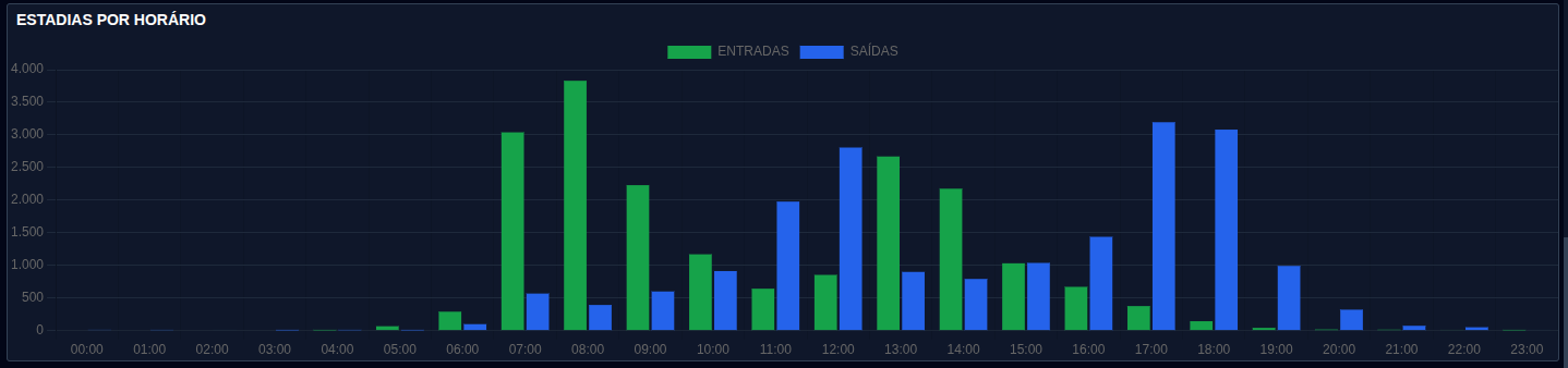 Visualização gráfica do fluxo de entradas (barras verdes) e saídas (barras azuis) ao longo das 24 horas do dia.