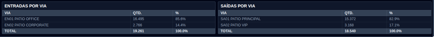 - (-) Entradas Canceladas: Entradas que foram canceladas manualmente por operadores, pelo próprio cliente na entrada ou na automação.