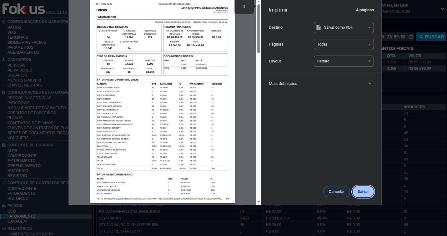 O Relatório de Faturamento é o principal documento de prestação de contas do sistema Fokus. Ele consolida todas as informações financeiras e operacionais do estacionamento em um único documento, permitindo o acompanhamento completo da performance do negócio.