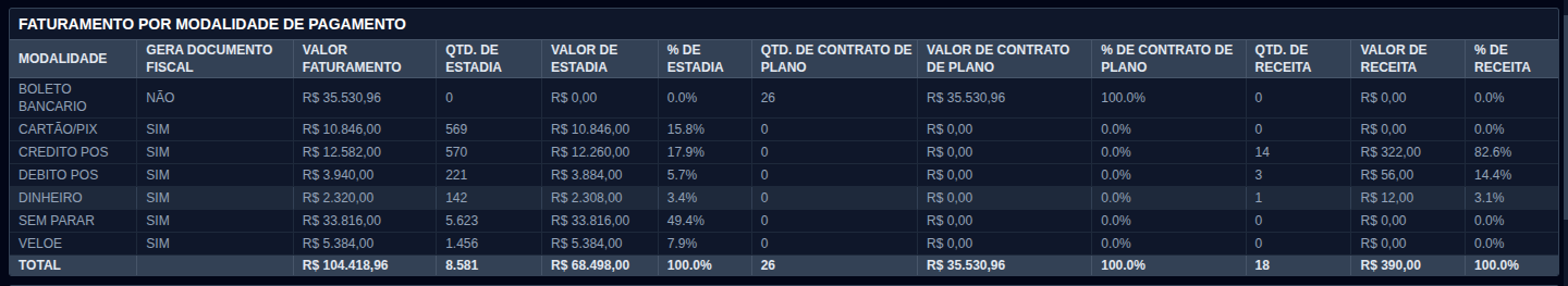 - Qtd. de Estadia / Valor de Estadia / % de Estadia: Quantidade de estadias pagas por aquela modalidade, valor total e percentual do faturamento rotativo.
