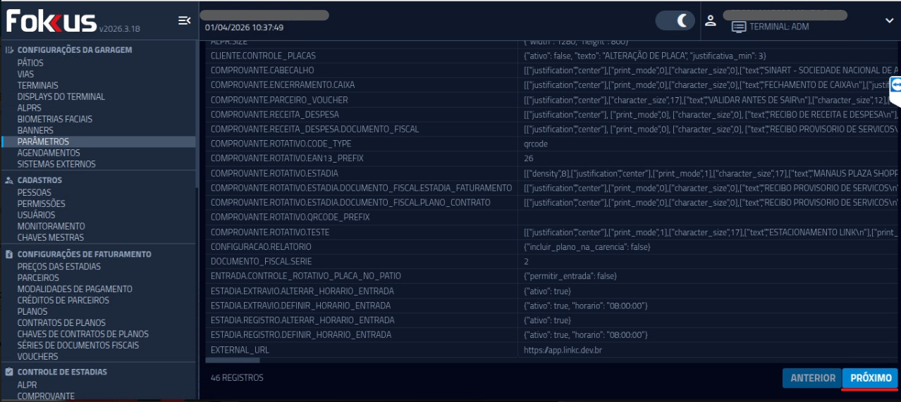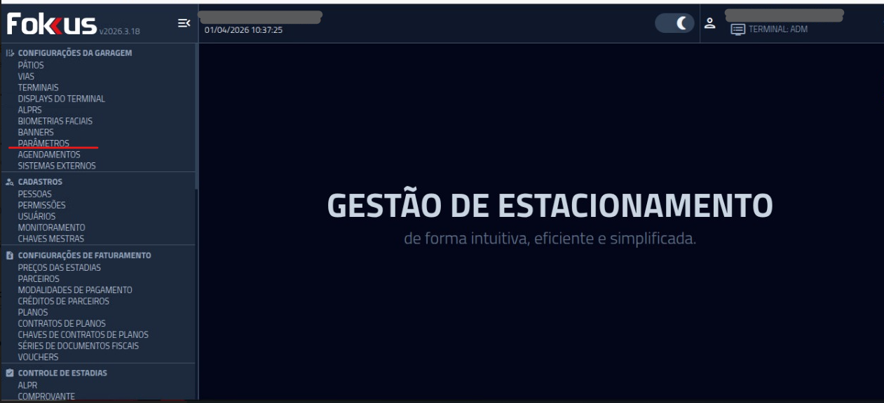 1- Localize a opção "PARÂMETROS" na aba de Configurações da Garagem: