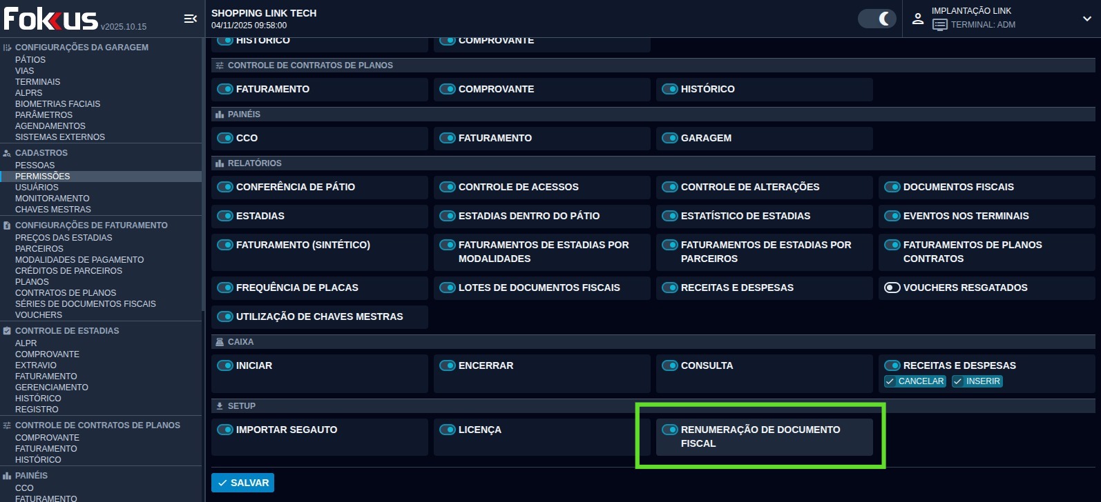 - Liberar permissões para RENUMERAÇÃO DE DOCUMENTOS FISCAIS