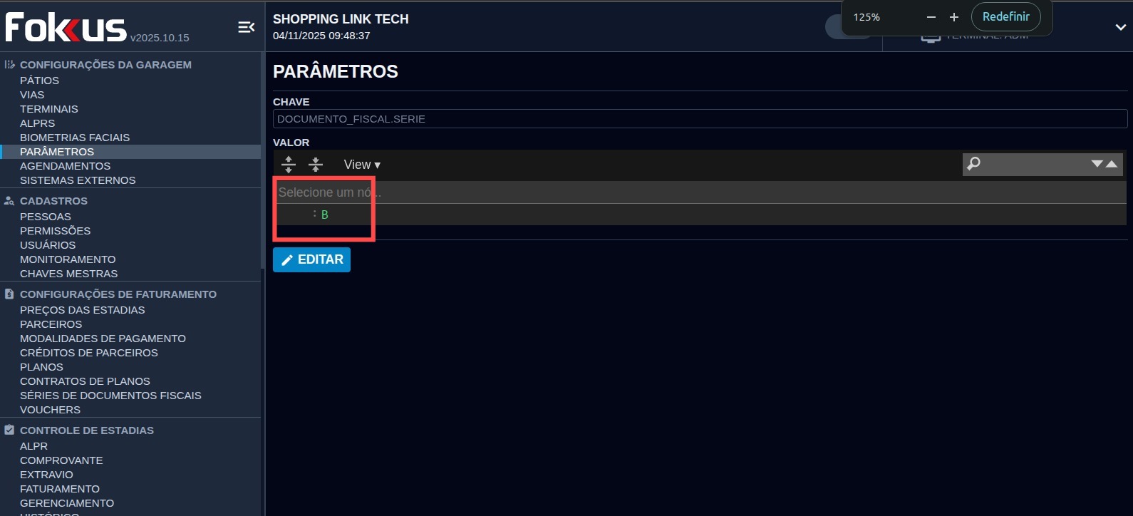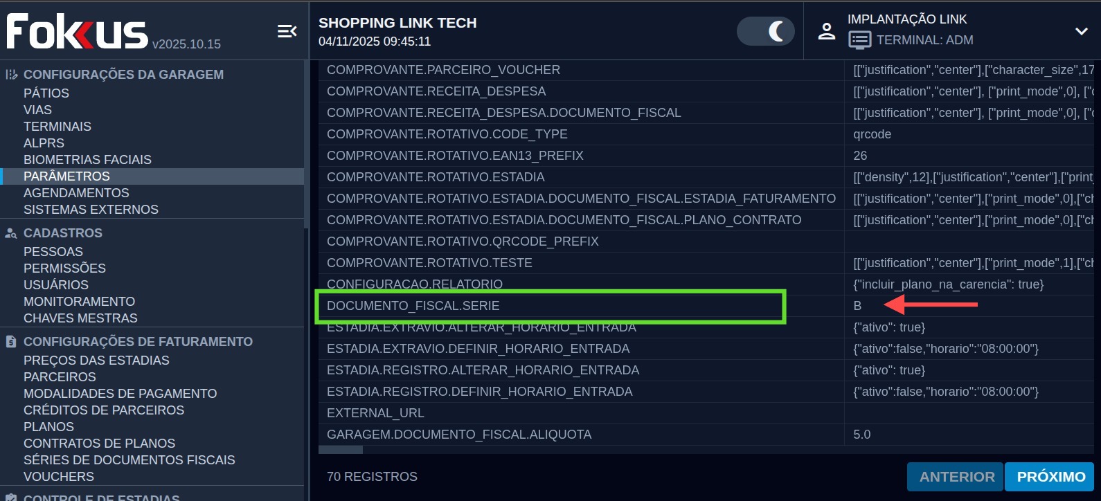 - Em caso de alteração do código da série, será atualizado automaticamente em PARÂMETROS
