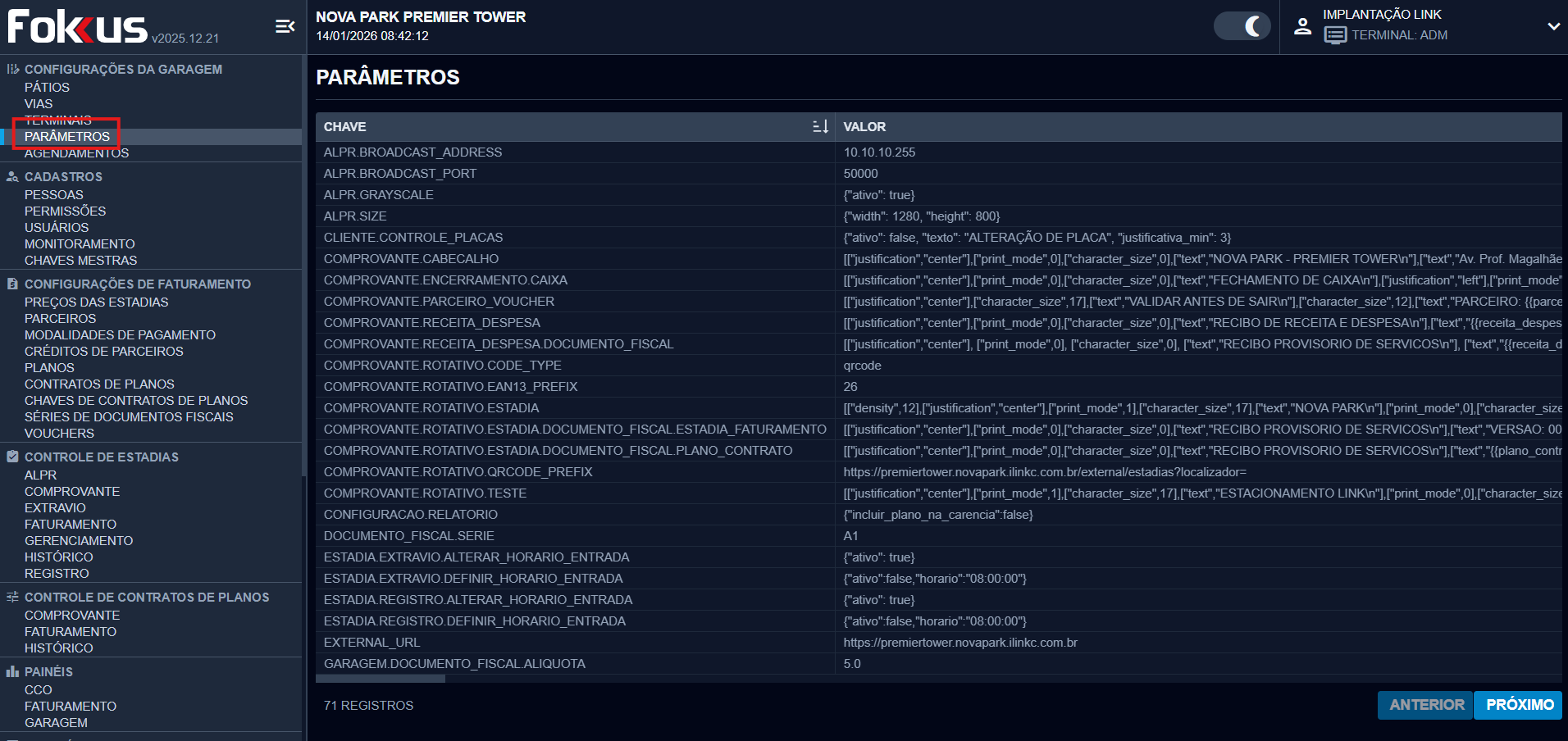 Essa área concentra todas as configurações gerais do sistema, incluindo parâmetros de comprovantes, ALPR, faturamento e integrações.