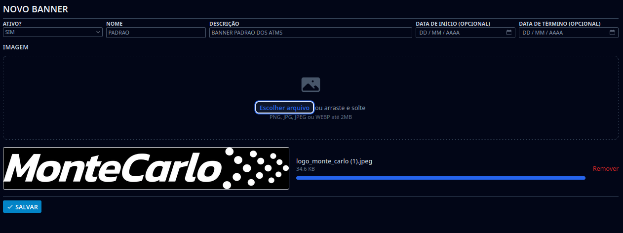 Clique em <+ Criar primeiro banner> dê um nome e descrição para o banner e use a opção <Escolher arquivo> para selecionar o arquivo com a imagem