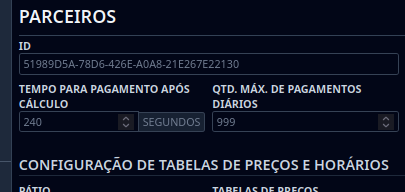 Dentro do parceiro procure o campo <TEMPO PARA PAGAMENTO APÓS CÁLCULO> e configure o tempo para 240 segundos