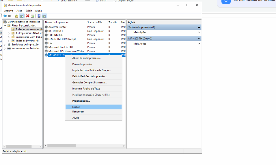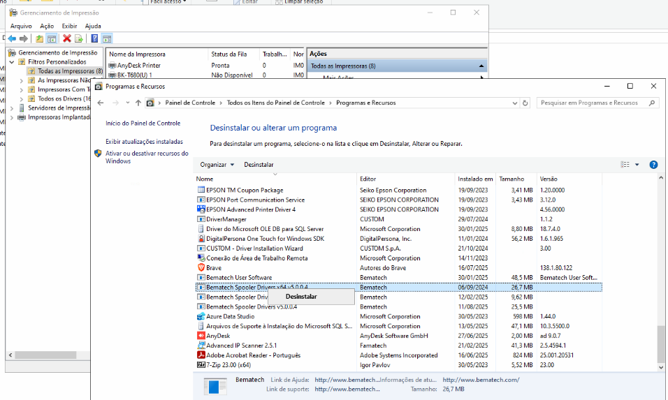 - Remova todos os resíduos de drivers e recursos da Bematech/Elgin (Menu iniciar > Gerenciamento de impressão):
