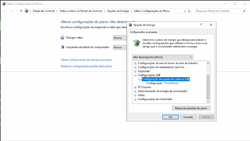 - Ajuste as opções de energia para alto desempenho e desabilite a Configuração se suspensão seletiva USB