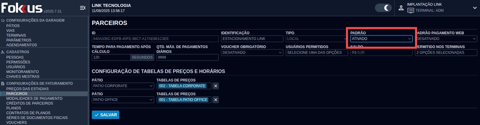 ⚠️ LEMBRE-SE: O Parceiro Padrão é a base de funcionamento de todo o sistema Fokus. Sua desativação pode causar paralização completa da operação do estacionamento.