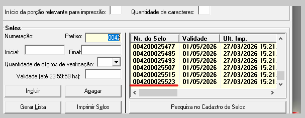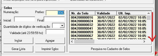 6 - Arraste até o final para ver o último selo gerado e conferir o prefixo + numeração