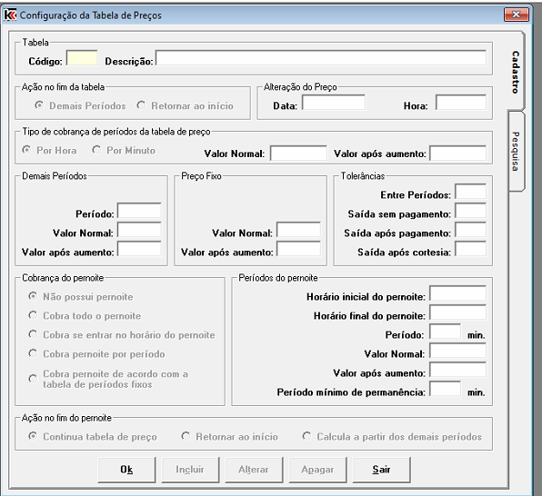 - Quantidade de tempo (minutos) de tolerância para saída sem pagamento e entre períodos