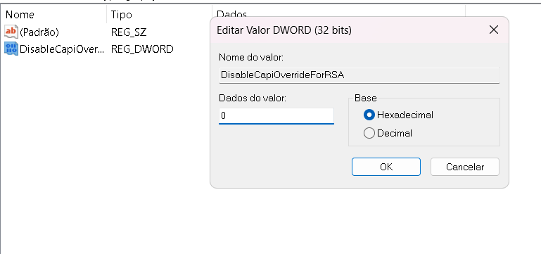 3. Altere o valor de "DisableCapiOverrideForRSA" para 0
