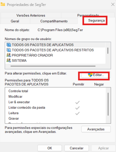 Na janela Propriedades de SegTer, selecione a aba Segurança.