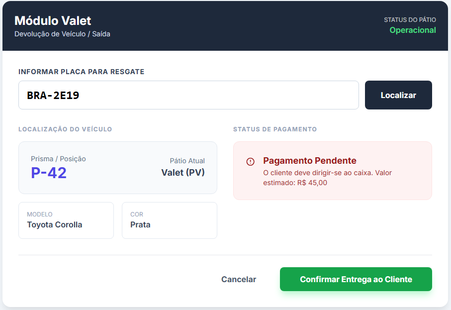 Para a gestão do Valet seria criada uma interface onde o operador informaria a placa do veículo, o sistema pesquisaria no pátio se esta placa já existe. Caso a placa já esteja no pátio principal, o sistema perguntará ao operador se deseja mover o veículo para o Pátio Valet. Caso a placa não exista, o sistema solicitará o ticket que o usuário gerou no momento da entrada. A partir daí o sistema vinculará a placa do veículo no ticket e moverá o veículo para o Pátio Valet. O operador poderá informar o número do prisma (espécie de tag magnética colocada sobre o veículo) ou a posição onde o veículo ficará estacionado, para facilitar a devolução posteriormente. O sistema também será capaz de armazenar o modelo e a cor do veículo, bem como o nome do motorista, por questão de segurança do processo. Após a confirmação, o sistema imprimirá um recibo para o cliente com as informações fornecidas.